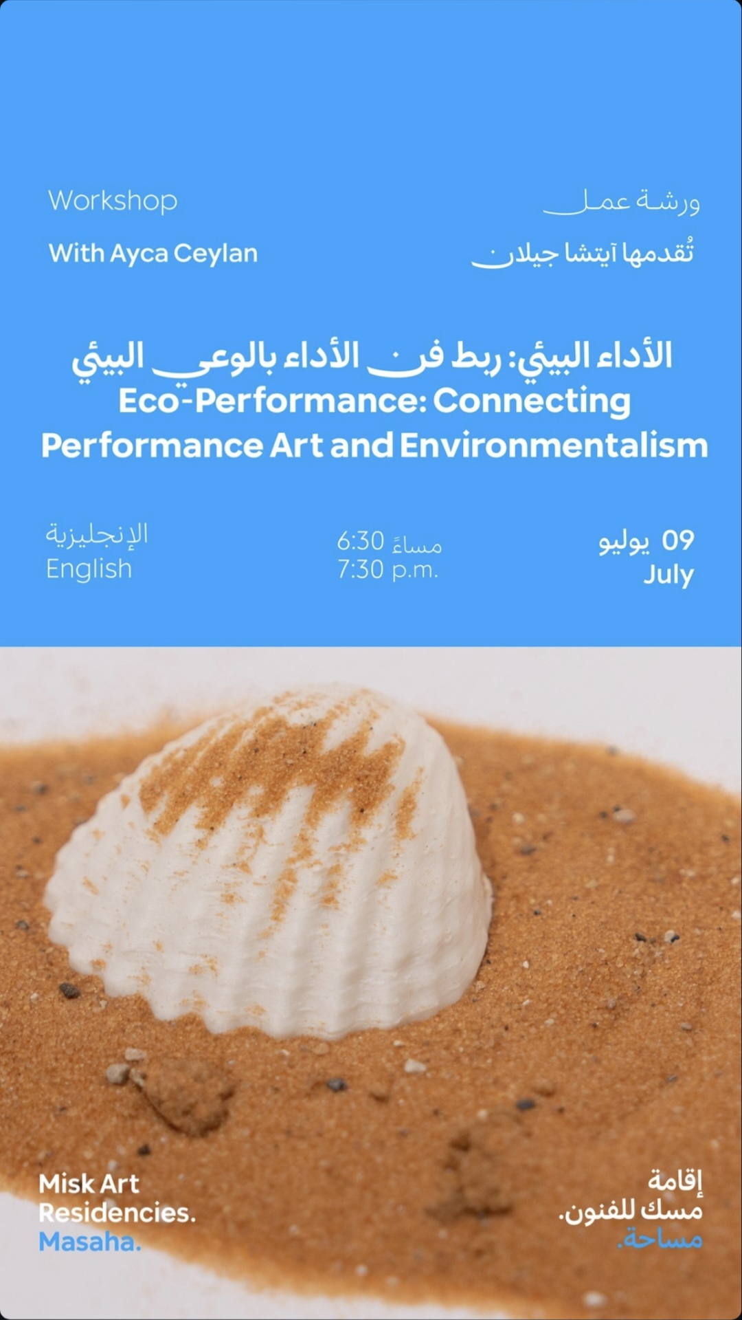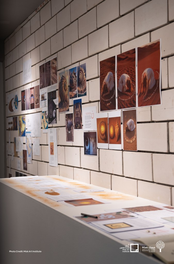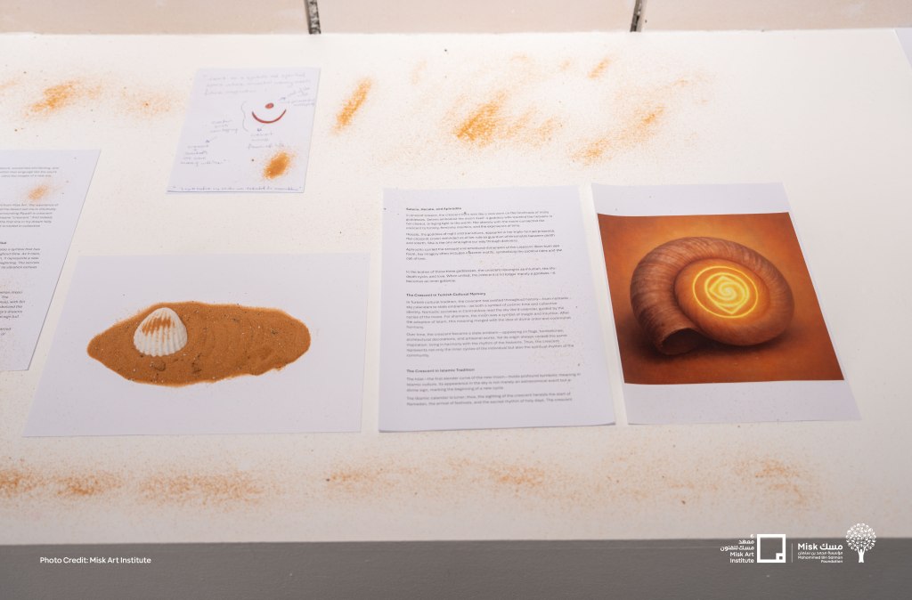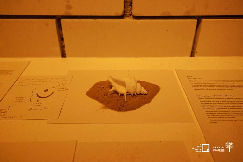 Rooted in intuition and visionary experiences, the artwork asks: “How do the sands of the past shape the landscapes of the future?” Inspired by the crescent-shaped dunes of the Al-Dahna desert and the ancient seashells found in AlUla, alongside the sacred letter nun (ن) – a symbol in Islamic tradition that resonates with both crescent and shell-the artwork explores circular forms as portals to cyclical time and multidimensional creation.